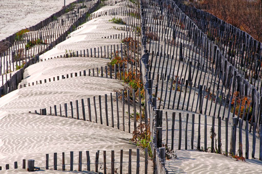 Les ganivelles, barrières formées par des lattes de bois, aident à la reconstruction des dunes et préviennent ainsi le recul du trait de côte.